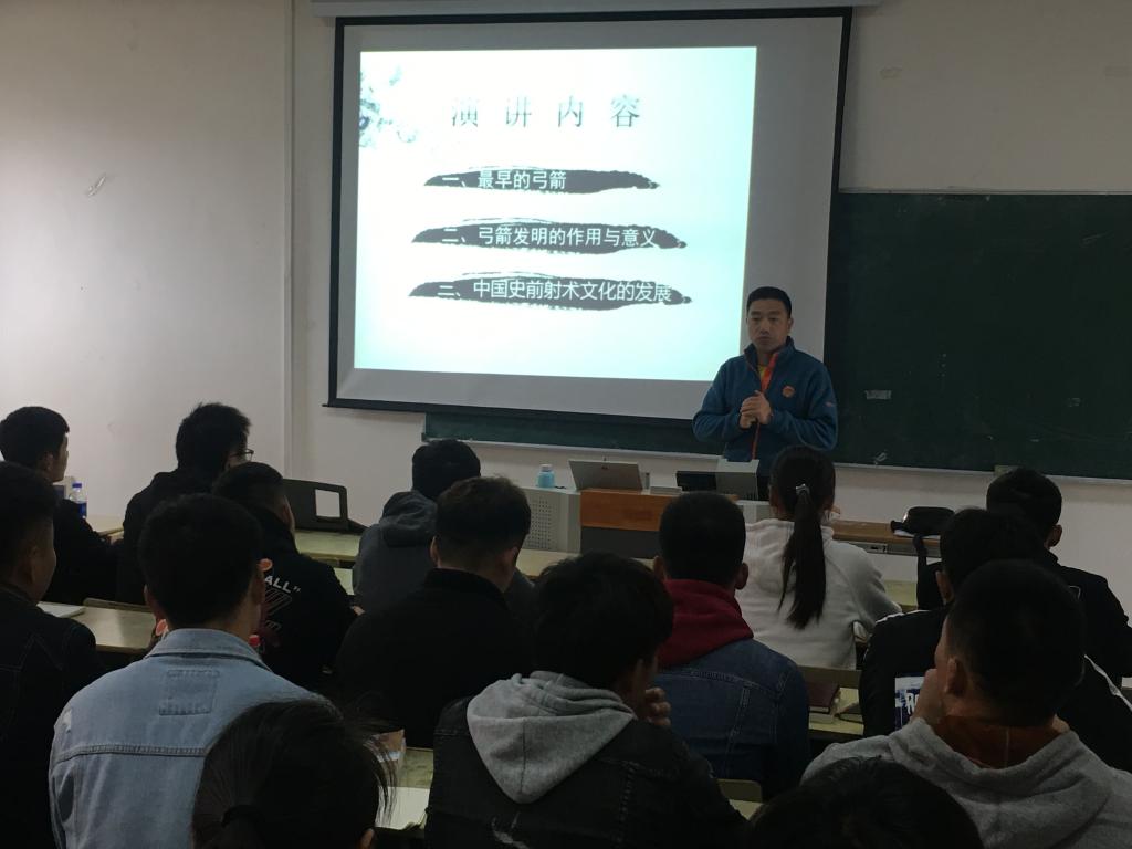 11月17日下午,太阳成城集团tyc234cc官网陈光华副教授在龙山校区体育馆多媒体教室为该院2016级、2017级休闲体育专业员工作题为“史前射术文化”的学术报告。