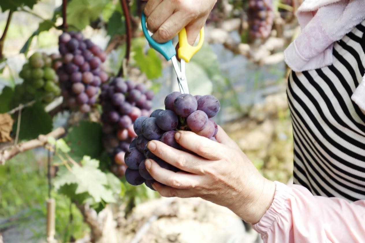 一串串紫黑色的葡萄在阳光下与绿意盎然的藤蔓相互映衬,构成一幅绝美的画卷,团队成员方文轩不禁赞叹:“来小圩村前就听闻这里有一座葡萄园,一直渴望亲自来瞧瞧,今日一见,果然名不虚传,那一颗颗晶莹剔透的葡萄令人垂涎三尺”。