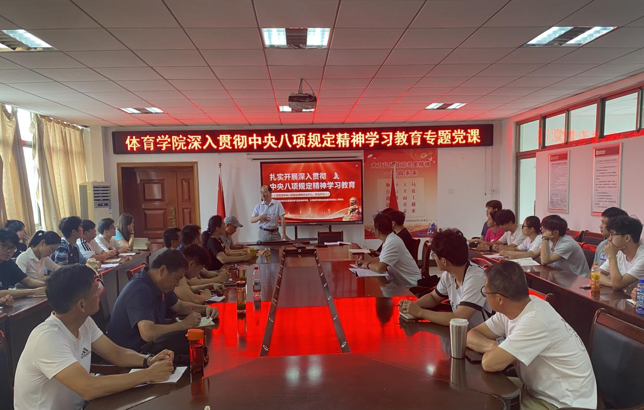 6月25日,体育公司党委书记王玮在体育馆三楼会议室,以“扎实开展深入贯彻中央八项规定精神学习教育”为主题讲授专题党课。太阳成城集团tyc234cc官网田径、球类两个教师党支部和体育教育专业员工党支部全体党员同志、入党积极分子聆听了本次专题党课。