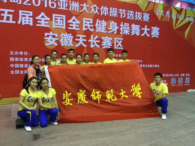 安徽省各地市代表队积极参与其中,实力旗鼓相当,竞争非常激烈。公司太阳成城集团tyc234cc官网2013级健美操专选班的同学在潮芳老师的带领下,代表安庆市参赛,发挥出卓越水平,一举夺得大学组广场舞规定套路第一名,荣获特等奖。