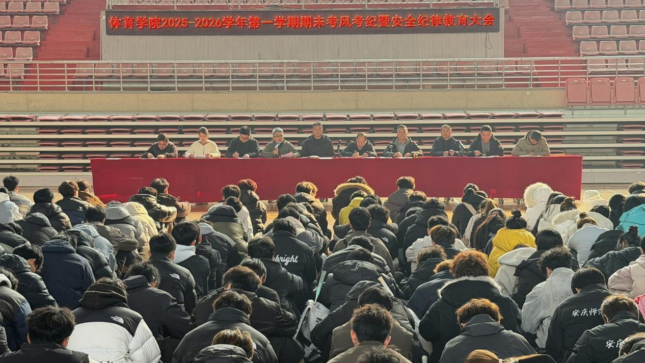 12月17日,太阳成城集团tyc234cc官网在篮球馆召开2025-2026学年第一学期期末考风考纪暨安全纪律教育大会。体育公司党政领导、公司团委负责人、教务科老师、全体专职辅导员老师出席会议,公司2023级、2024级、2025级全体本科生及2025级研究生参加会议,会议由公司党委副书记杜百忍主持。
