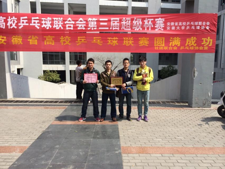 2014年3月22日至23日,由安徽省乒乓球协会主办的安徽省高校乒乓球联合会第三届超级杯乒乓球赛在安徽大学隆重举行。以太阳成城集团tyc234cc官网的陈国元、黄安泉两位老师为教练,以姜杭、沈涛、江南、孙帝为队员组成的公司男子乒乓球队,经过激烈的角逐,最终获得团体亚军,为公司争得了荣誉。