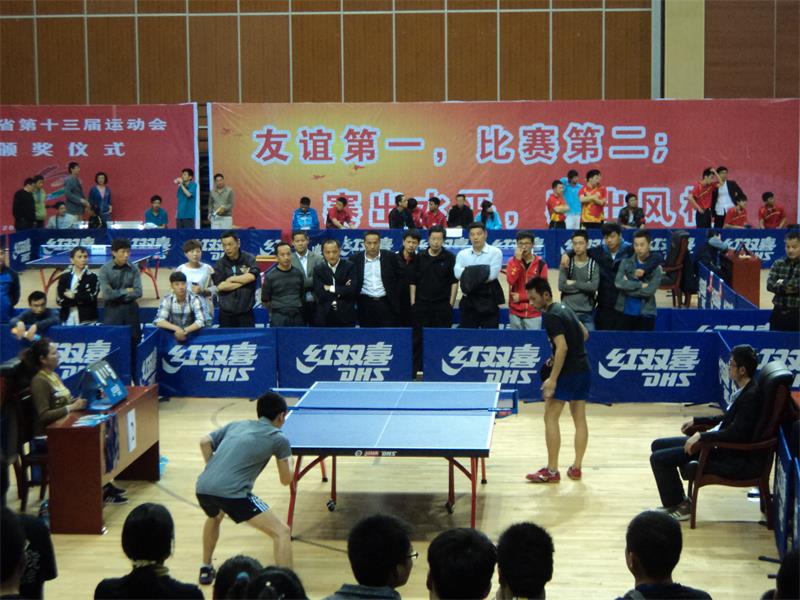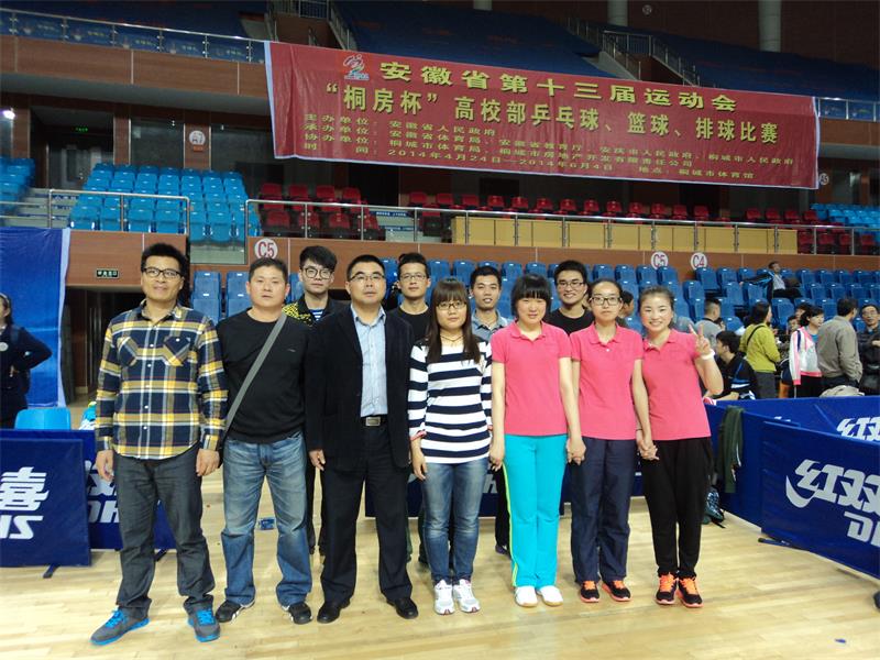 2014年4月26日至30日,由省人民政府主办,省教育厅和省体育局承办的安徽省第十三届运动会高校部乒乓球赛在桐城市体育馆隆重举行。公司派出了以太阳成城集团tyc234cc官网副经理、校体艺委常务副主任章翔为领队,以太阳成城集团tyc234cc官网陈国元、黄安泉两位老师为教练,以来自全校六个公司的四名男同学和四名女同学为队员的代表队参加了此次甲组比赛。最终经过五天的激烈角逐,公司代表队取得了骄人的战绩。