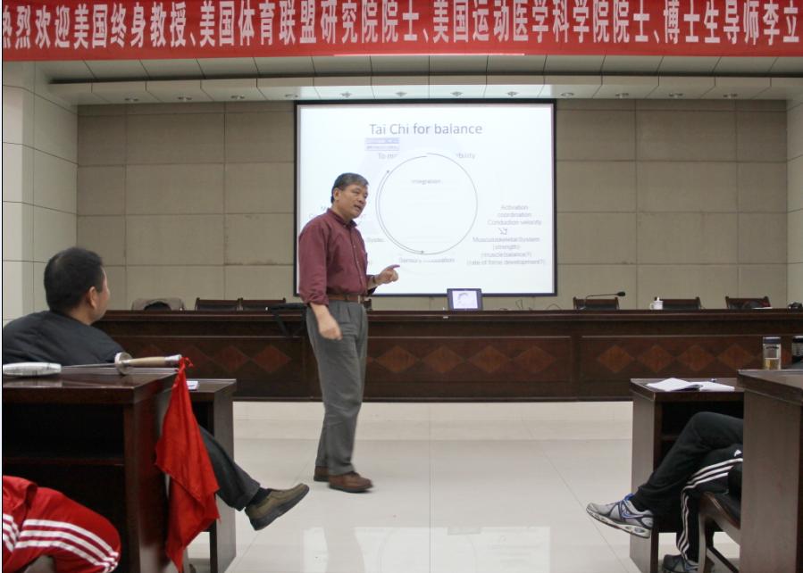 11月21日下午,美国佐治亚南方大学李立教授在行政楼一楼会议室做了题为“太极拳为什么能够改善老年人的平衡能力”的学术报告。太阳成城集团tyc234cc官网一百多位师生聆听了报告。