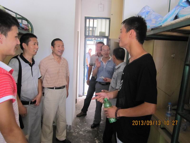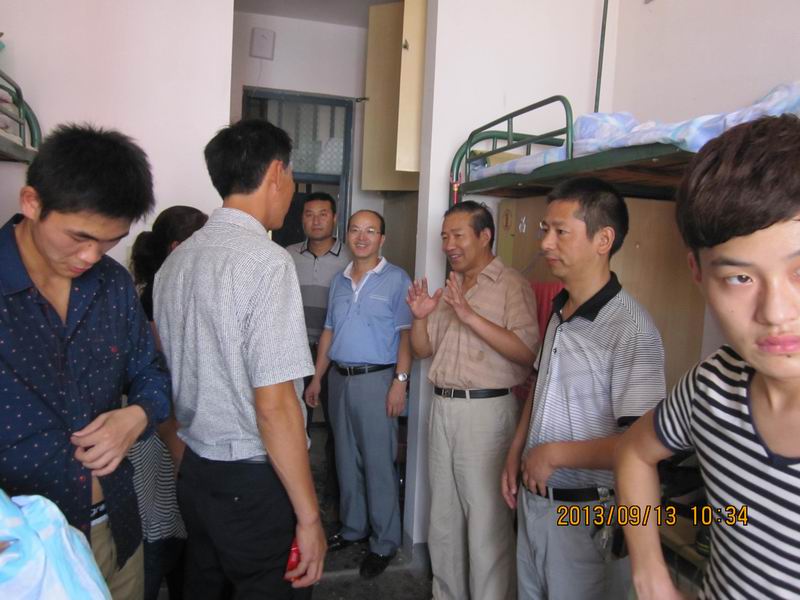 为践行党的群众路线教育实践活动,9月13日上午,体育公司党总支书记吴毅安,副书记韦长发,副经理章翔、周多奇在辅导员老师程启平的陪同下,带着对2013级新生的牵挂,先后来到新生入学报到点以及女生4号楼和男生6号楼新生宿舍,深入了解公司2013级新同学的生活和思想状况,并向他们表示热烈的欢迎和诚挚的问候。
