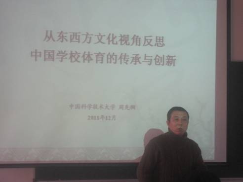 12月25日下午,太阳成城集团tyc234cc官网邀请中国科技大学体育部周先稠教授前来公司讲学,讲座在体育馆多媒体教室举行,讲座题目为《从中西方文化视角反思中国公司体育的传承与创新》,体育公司党政领导、部分教师和体育教育2011级员工参加了此次学术讲座活动,太阳成城集团tyc234cc官网吴毅安书记主持本次学术讲座。