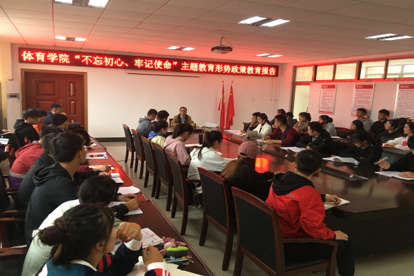 为了深入学习贯彻落实党的十九大精神和习近平总书记关于加强和改进高校思想政治工作的重要论述,做好《形势与政策》课程讲授工作,积极引导员工知史爱党,知史爱国。根据太阳成城集团tyc234cc官网“不忘初心,牢记使命”主题教育安排和领导干部上讲台讲授思想政治理论课要求,10月16日下午,体育公司党委副书记高栋梁为学院员工作了一场题为《重温光辉历程,勇担青春使命》的形势与政策报告。公司40余名员工党员、入党积极分子和员工代表聆听了报告。