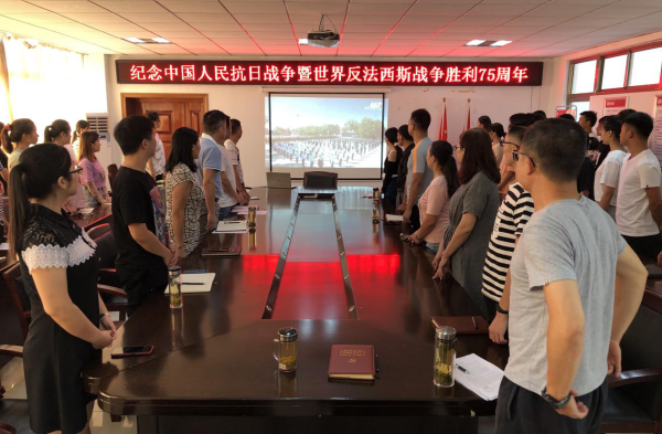 “起来,不愿做奴隶的人们……,我们万众一心,冒着敌人的炮火,前进,前进,前进,进!”体育馆会议室内回荡着公司师生齐声高唱国歌的声音。国歌唱毕,全场肃立,向在中国人民抗日战争中英勇牺牲的烈士默哀。