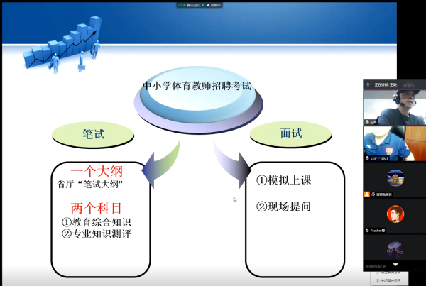 王琦以“精心准备 精心备考”为主题,从为什么要实行教师招聘考试,考什么、怎么考和怎么应对四个方面,详细介绍了中小学体育教师招聘考试笔试技巧。最后他以勠力同心、不忘初心、深入人心三个词语祝愿各位同学今后考编能够取得成功。