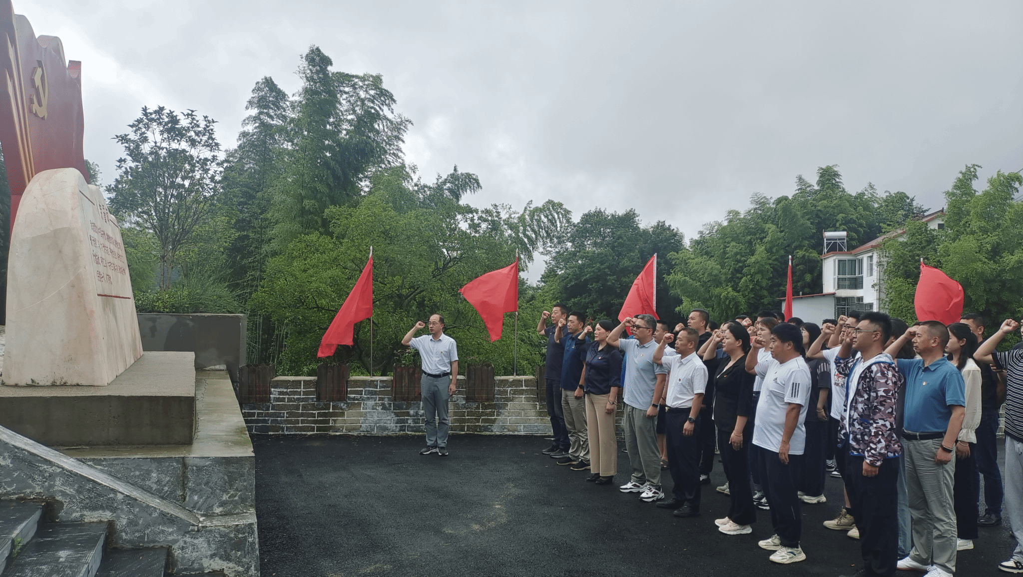 在革命遗址前的广场上,公司党委副书记、纪委书记王玮带领大家怀着无限崇敬的心情,面向鲜红的党旗,庄重地紧握右拳,一字一句、铿锵有力地重温入党誓词,进一步牢记初心使命、锤炼党性修养。