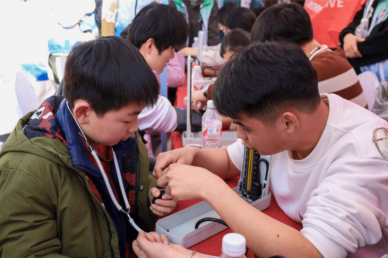 活动开始前,师生们早早到达现场做本次活动的准备工作,指导员工们着手检查仪器的精确性,并率先为班级同学进行血压测量,用以熟练本次操作流程。“大家一定要保持血压计垂直于桌面,注意观察数据的波动范围。”“要把听诊器摆放正确。”“可以用手机放置在仪器空隙处来起到支撑稳定的效果。”员工们纷纷表达自己的看法与建议。