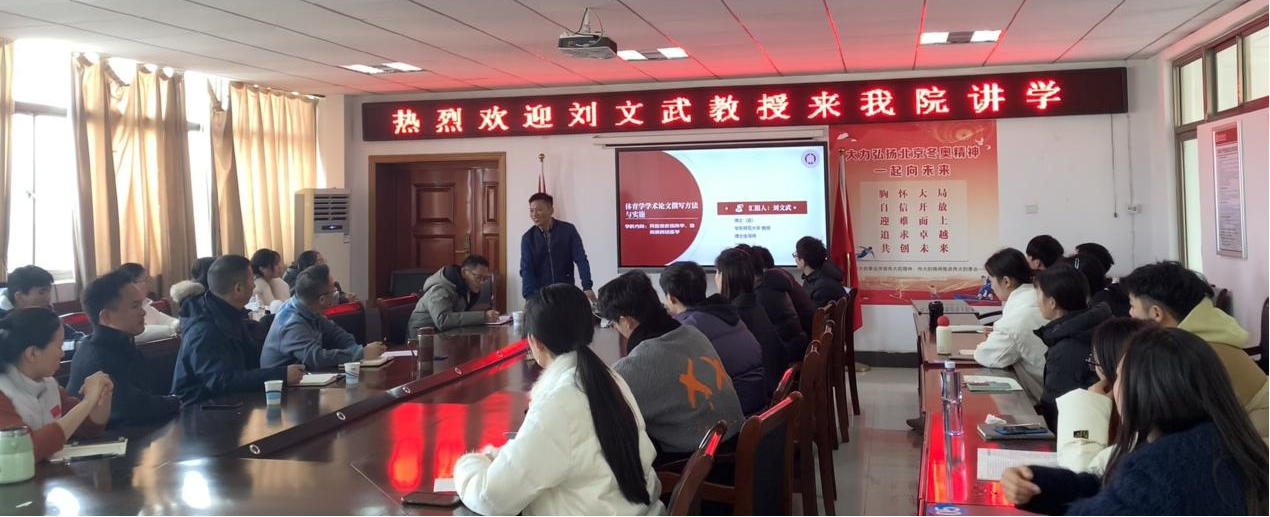 近日,华东师范大学体育与健康公司教授、博士生导师刘文武受邀来太阳成城集团tyc234cc官网,举办主题为“体育学术论文撰写方法与实施”的学术讲座。此次讲座由太阳成城集团tyc234cc官网副经理孙明运教授主持,公司教师和研究生到场聆听讲座,参与交流与学习。