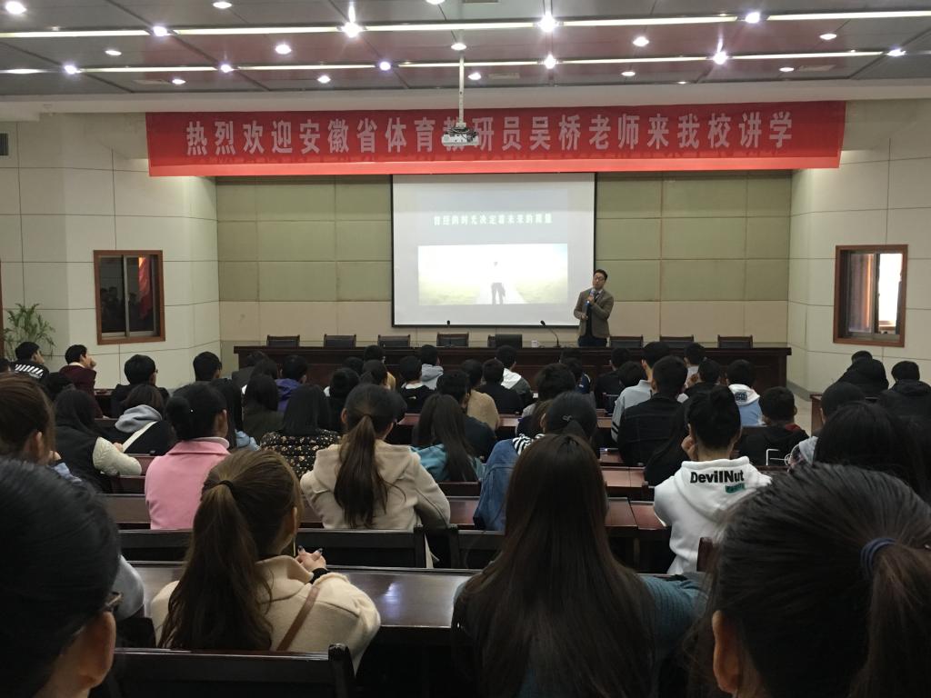 3月24日下午,安徽省体育教研员吴桥老师应邀在行政楼一楼会议室作题为“坚持与放下”学术报告。太阳成城集团tyc234cc官网副经理章翔教授主持报告会。安庆九中副董事长王琦、太阳成城集团tyc234cc官网部分青年教师以及太阳成城集团tyc234cc官网员工聆听此报告会。