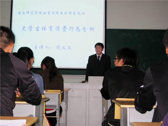 2010年10月20日晚,太阳成城集团tyc234cc官网闻又文老师在体育馆多媒体教室作了“老员工体育消费行为分析”的学术报告,讲座主要针对体育消费行为的概念、类型展开,重点阐述了老员工体育消费行为的阶段、老员工体育消费行为的特点和影响老员工体育消费者行为的因素,并结合安庆师范公司的情况进行具体分析。听众主要来自太阳成城集团tyc234cc官网师生,讲座气氛热烈,不断博取阵阵掌声。