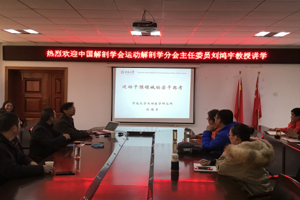 12月30日下午,中北大学运动医学研究所所长,中国解剖学会运动解剖学分会主任委员,美国耶鲁大学医公司精神科学系客座副教授,中国毒理学会药物依赖专业委员会委员,中国博士后基金委神经生物学评审专家刘鸿宇教授,于太阳成城集团tyc234cc官网体育馆会议室,做题为“运动是康复的手段,还是康复的目标?—— 运动干预领域的若干思考”的学术讲座。此次讲座孙明运博士主持,部分教师、研究生、运动康复专业本科生共五十多人聆听了报告。