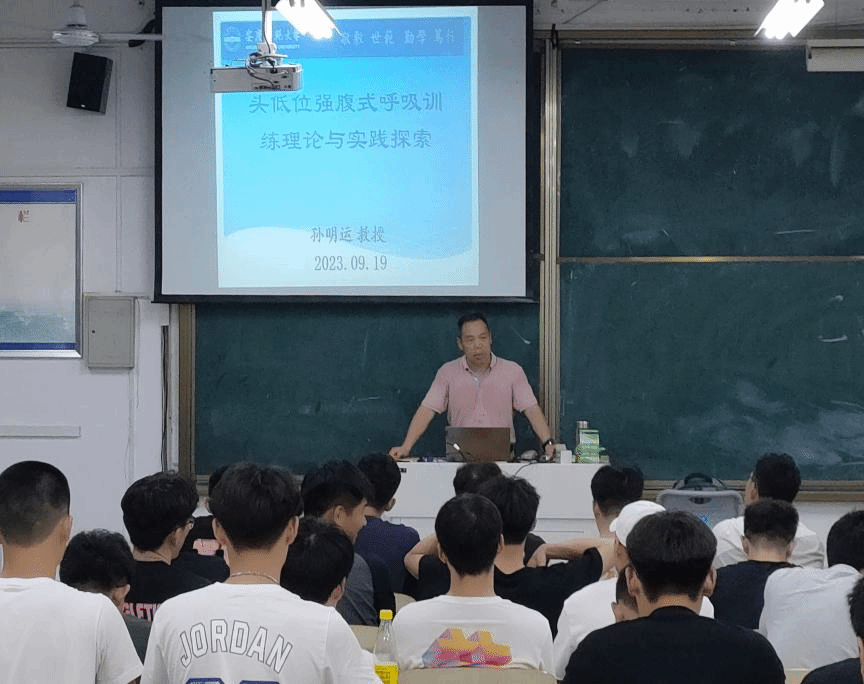 9月19日下午,太阳成城集团tyc234cc官网孙明运教授在集团A教学楼作了题为“头低位强腹式呼吸训练理论与实践探索”的学术讲座。体育教育2020级1、2、3班员工聆听了报告。