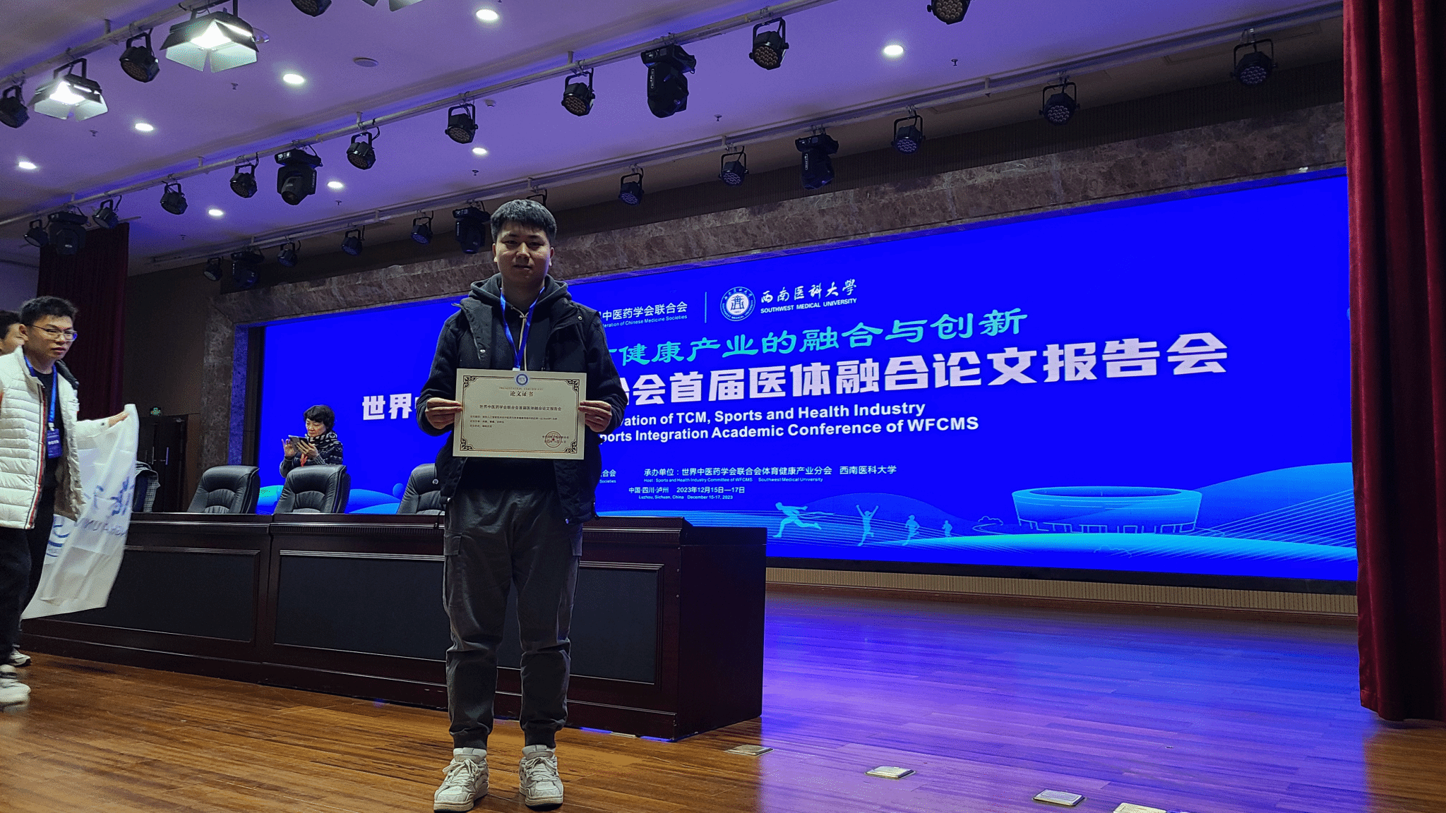 2023年12月15-16日,世界中医药联合会首届医体融合论文报告会在西南医科大学隆重召开,世界中医药联合会医学专家、体育学专家、教授、研究生等共三百余人参加了本次盛会。公司师生孙明运教授、研究生漆巍受邀参加学术会议。