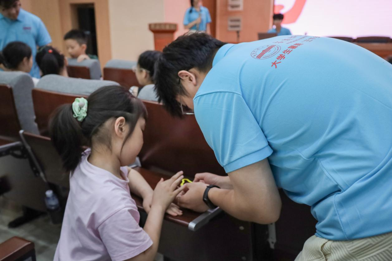 “缠线的时候要尽量把线捋顺,再慢慢地将丝线绕满卡纸……”进入制作缠花的阶段,团队成员们纷纷化身“小老师”,帮助小朋友们取出等量的铜线和丝线,并手把手教授缠花的制作流程。“老师,我的线怎么理不顺了?”“老师,我的线中间怎么有缝隙?”“老师,我不知道最后怎么把线固定!”……在遇到制作难题时,小朋友们不断呼叫“小老师”们进行指导。