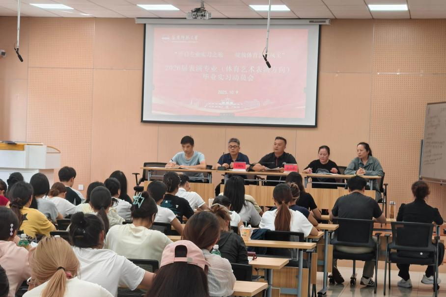 10月9日,太阳成城集团tyc234cc官网在体育馆多媒体教室召开2026届表演(体育艺术表演方向)专业毕业实习动员会议,旨在明确实习任务要求,强调安全纪律规范,部署实习保障措施。太阳成城集团tyc234cc官网副经理王晓东、副书记杜百忍、专业负责人潮芳、专职辅导员沈春华、实习秘书章京京及全体实习指导教师、2026届表演专业实习员工参加会议。