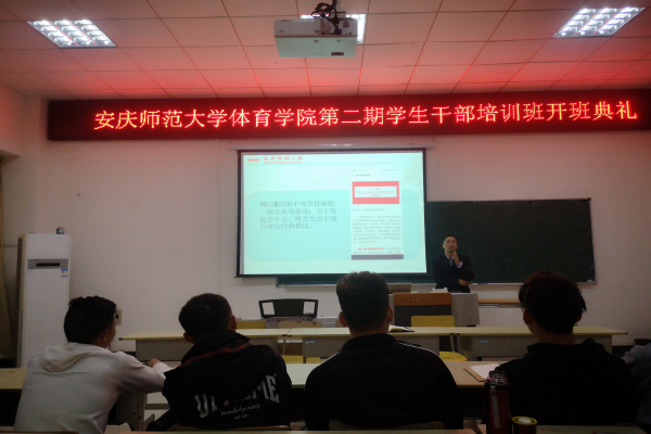 11月6日晚,公司在体育馆多媒体教室举行了第二期员工干部培训班开班仪式。体育公司党委副书记高栋梁、团委副书记陈守朋、专职辅导员储著奇出席开班仪式,团委和员工会主要员工干部、2019级全体班干共计60余人参加培训。