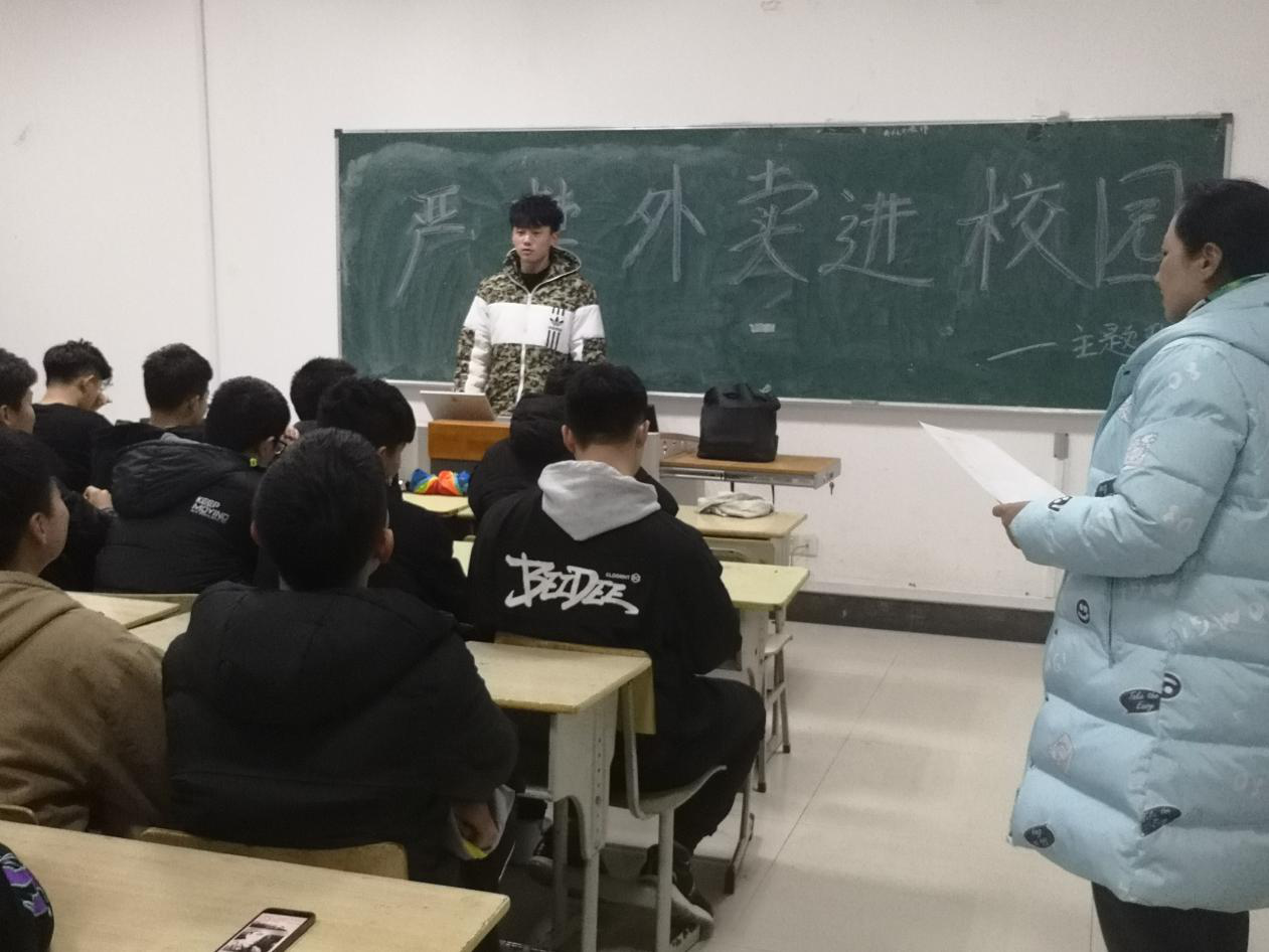 主题班会上,辅导员沈春华老师列举近期媒体高度关注的“地沟油”、“塑化剂”及食物中毒事件等案例,告诫员工们食品安全关乎每个人的生命健康。看似方便的外卖存在极大的安全隐患,有的外卖商家为追求低成本、高利润,可能采购低价无保障食材,制作环境恶劣,卫生不达标,对同学的健康造成极大的危害。送外卖车辆车速快,校园交通安全隐患凸显。且越来越多的同学依赖“外卖”送货上门服务而“宅”在宿舍,缺乏户外运动锻炼。