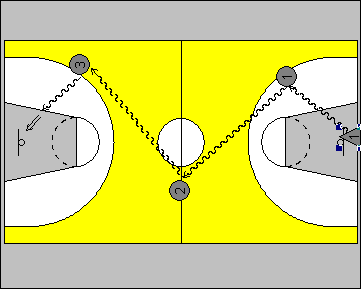 3、多种变向运球上篮:考生在球场端线中点站立,面向前场,用右手运球至①处,以考生起动跑开始计时,在①处做背后运球变向,换左手向②处运球,至②处做左手后转身运球变向,换右手运球至③处,右手跨下运球后右手上篮。球中篮后方可用左手运球返回③处,做背后运球,换右手运球至②处做右手后转身运球变向,运球至①处左手跨下运球后左手上篮。球中后做同样动作再重复一次,回到原处停表。